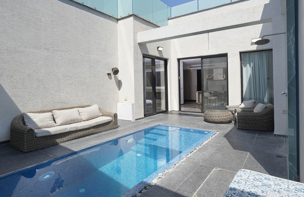 הסוויטה כוללת בריכת שחייה פרטית, מגודרת, מחוממת ומקורה, ומציעה חווית רחצה מפוארת לכל עונות השנה. במתחם החיצוני תוכלו למצוא פינות ישיבה נוחות, מיטות שיזוף, שולחן גינה ועמדת מנגל BBQ (מותרת לא בשבת) לארוחות בלתי נשכחות תחת כיפת השמיים.