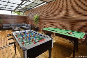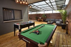 מתחם החצר המפואר כולל שולחן סנוקר חיצוני, עמדת מנגל BBQ ופינות ישיבה נוחות עם ריהוט גן איכותי. לילדים מוצעים מתקני חצר מהנים ופינג פונג. ואם תרצו, תוכלו לנצל את מגרש הכדורגל הפרטי.
