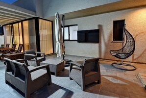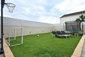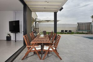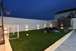 במתחם החיצוני תמצאו שולחן פינג פונג, מגרש כדורגל, מגרש כדורסל וטרמפולינה. פינות ישיבה נוחות, ריהוט גן חיצוני ומיטות שיזוף משלימים את האווירה. ולחובבי המנגל, ישנה עמדת מנגל BBQ (מותרת, לא בשבת).