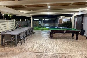 הוילה כוללת מתחם חיצוני עשיר בפעילויות: פינג פונג, שולחן סנוקר חיצוני, ועמדת מנגל BBQ (לא בשבת). עבור הילדים, ישנם מתקני חצר, טרמפולינה וערסל. תוכלו ליהנות מכל אלו תוך כדי מנוחה על מיטות השיזוף המפנקות.