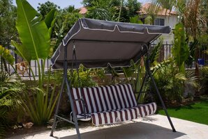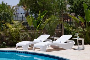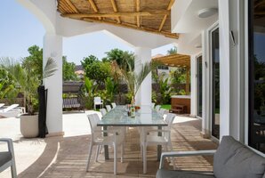 - חצר חיצונית עם פינות ישיבה, ערסל, מיטות שיזוף ועמדת מנגל BBQ.
