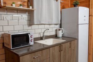 האבזור הקיים במטבח של בקתות שוהם: קומקום חשמלי, כיריים, מיקרוגל, מקרר, מקפיא נפרד.