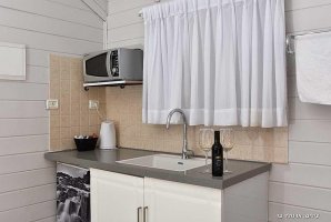 האבזור הקיים במטבח של סוויטות כחול לבן: קומקום חשמלי, כיריים, טוסטר, מיקרוגל, מקרר, מקרר קטן.