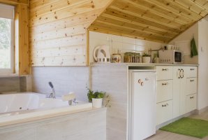 האבזור הקיים במטבח של אגדת דשא ברמות: קומקום חשמלי, כיריים, מיקרוגל, מקרר קטן.