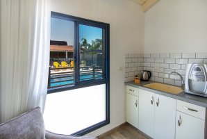 כל סוויטה מאובזרת במסך LCD עם שידורי YES, שולחן אוכל מרווח וארונות אחסון. במטבח תמצאו מקרר, תנור, כיריים ומיניבר מים, לצד מיקרוגל וקומקום חשמלי.