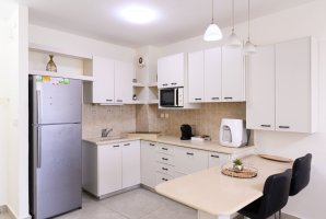 האבזור הקיים במטבח של רויאל סוויט קיסריה: קומקום חשמלי, תנור, מיקרוגל, מקרר.
